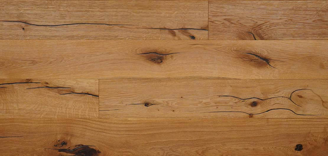 This amazing oak wood flooring has knots and river cracks that resemble nature